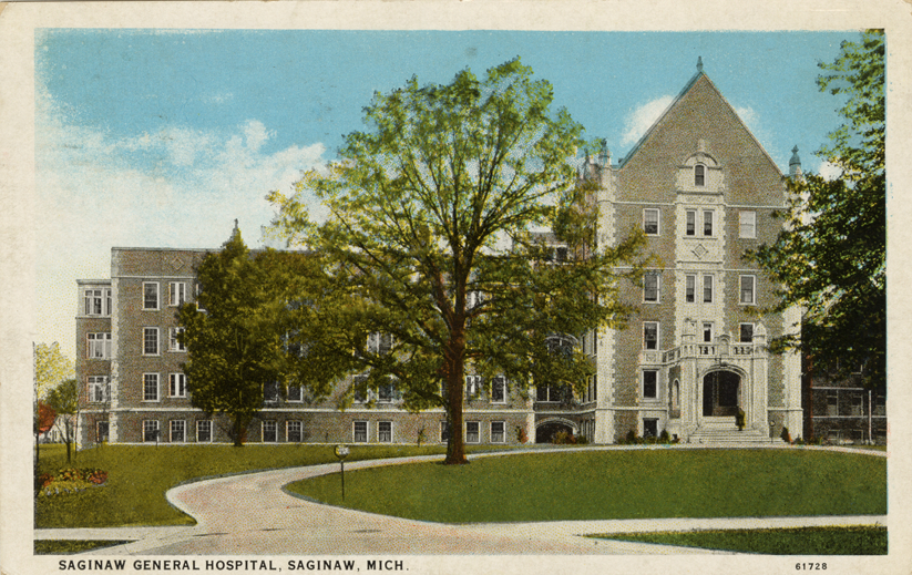 View of Saginaw General Hospital in Saginaw, Michigan. Printed on front: "Saginaw General Hospital, Saginaw, Mich." Printed on back: "Published by Saginaw Woodenware Co., Saginaw, Mich." Handwritten on back: "Dear Gerald, I'm stopping here on my way from Mackinac Island. Hope the summer session proved a huge success for you. Catherine." Card is postmarked August 22, 1929.