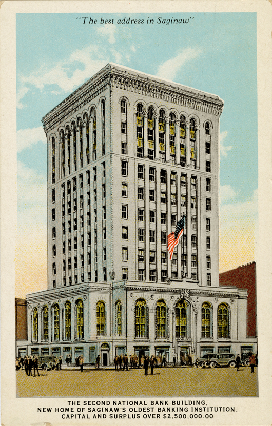 View of the Second National Bank in Saginaw, Michigan. Printed on front: "The Second National Bank building. New home of Saginaw's oldest banking institution. Capital and surplus over $2,500,000.00. The best address in Saginaw." Printed on back: "The Second National Bank, Saginaw, Michigan offers to its patrons complete financial service. Commercial, Safe Keeping, Savings, Bond and Trust Departments. W-6226. Seemann & Peters, publishers, Saginaw, Mich. Made in U.S.A."