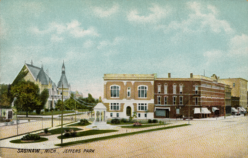 View of Jeffers Park in Saginaw, Michigan. Commercial buildings in background. Printed on front: "Saginaw, Mich. Jeffers Park." Printed on back: "Published by A.C. Dietsche, Detroit, Mich. and Frankfort, Germany. Made in Germany."