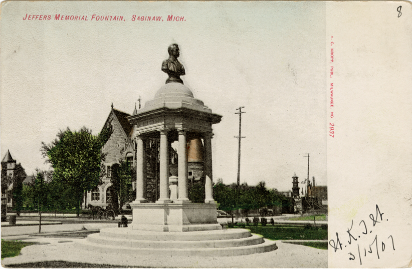 View of Jeffers Memorial Fountain in Saginaw, Michigan. Printed on front: "Jeffers Memorial Fountain, Saginaw, Mich. E.C. Kropp, publ. Milwaukee, no. 2937." Handwritten on front: "W.K.J.W. 3/15/07."