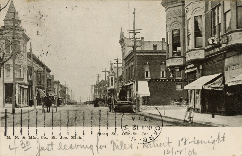 View of commercial buildings on State St. in St. Joseph, Michigan. Printed on front: "State St., Old St. Joe. M.N. & Mfg. Co., St. Joe, Mich." Handwritten on front: "430. Just leaving for Niles, Detroit 12 tonight. 10/12/06." Card is postmarked October 12, 1906.