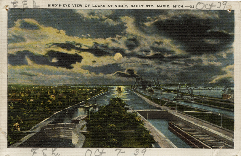 Nighttime view of the Soo Locks. Printed on front: "Bird's-eye view of Locks at night, Sault Ste. Marie, Mich." Handwritten on front: "F.E.L., Oct 7-39." Printed on back: "These locks are the world's greatest examples of engineering skill and of man's triumph over nature. During the shipping season 25,000 Great Lakes vessels pass through the 'Soo Locks,' a greater tonnage than any other system of locks in the world. Pub. by A.E. Young, Sault Ste. Marie, Mich. Made in U.S.A. Handwritten on back: "Oct. 6-39. Left Det. at 756. One hour at Bay City, 40 min at Midland-Climax. Dinner at Gladwin, 30 mins at Mackinac here at 650 then after supper went for a little ride believe it or not." Card is postmarked October 5, 1939.