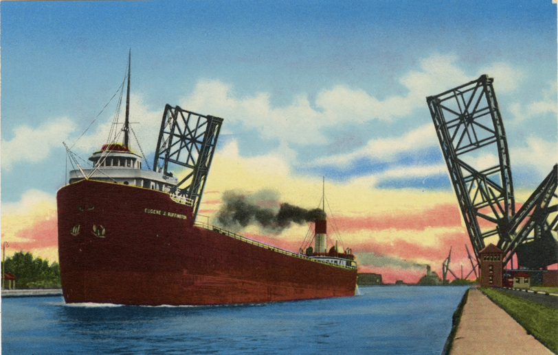 View of a freighter passing through bascule bridge, Sault Ste. Marie, Michigan. Printed on back: "Empty freighter passing bascule bridge, Lake Superior bound, Sault Ste. Marie, Mich. Published exclusively for Frank T. Patyk, Sault Ste. Marie, Mich. Genuine Curteich-Chicago 'C.T. Photochrom' post card (Reg. U.S. Pat. Off.)"