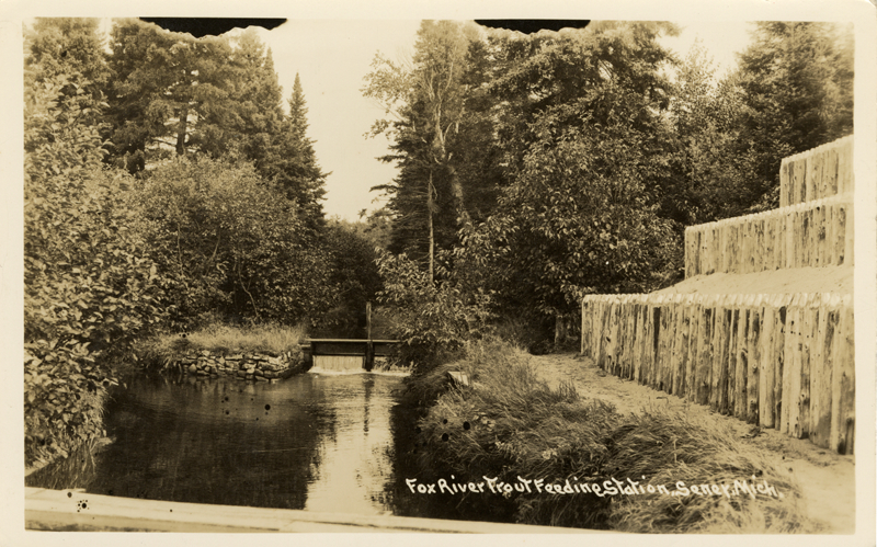 View of the Fox River trout feeding station in Seney, Michigan. Printed on front: "Fox River trout feeding station, Seney, Mich."