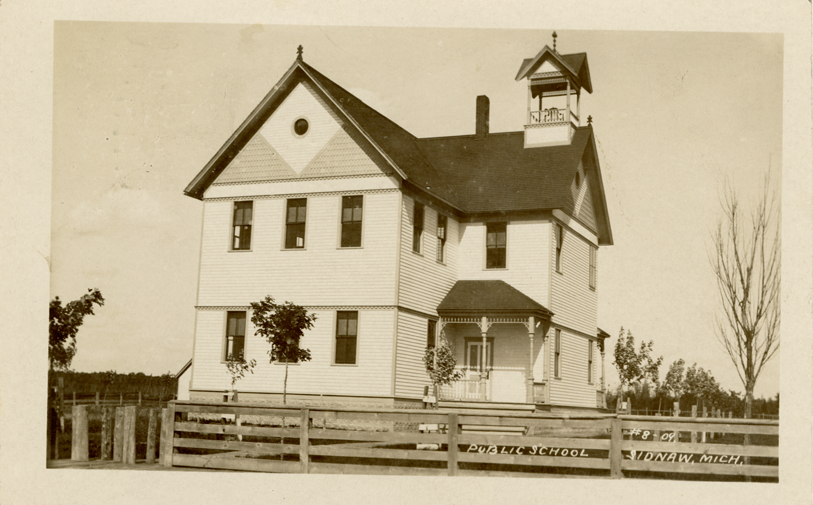 View of the wooden-frame schoolhouse at Sidnaw, Michigan. Printed on front: "Public school, Sidnaw, Mich." Printed on back: "B.H. Dingman, pub., Plymouth, Wis." Card is postmarked October 18, 1910.