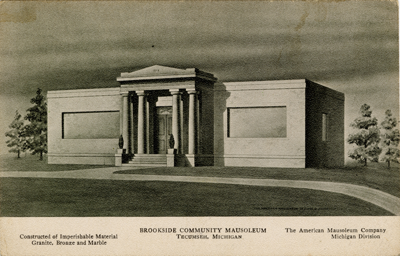 View of the Brookside Community Mausoleum in Tecumseh, Michigan. Printed on front: "Brookside Community Mausoleum, Tecumseh, Michigan. Constructed of imperishable material, granite, bronze and marble. The American Mausoleum Company. Michigan Division." Card is postmarked July 19, 1913.