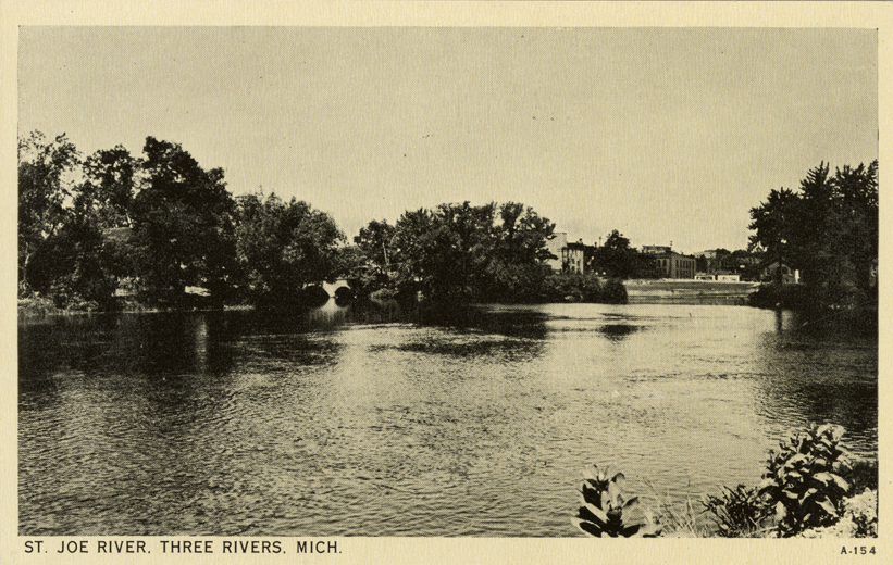 View of the St. Joseph River in Three Rivers, Michigan. Printed on front: "St. Joe River, Three Rivers, Mich." Printed on back: "Pub. by Hudson Drug Co., Three Rivers, Mich. Mfd. by Fort Wayne Printing Co., Fort Wayne, Ind."