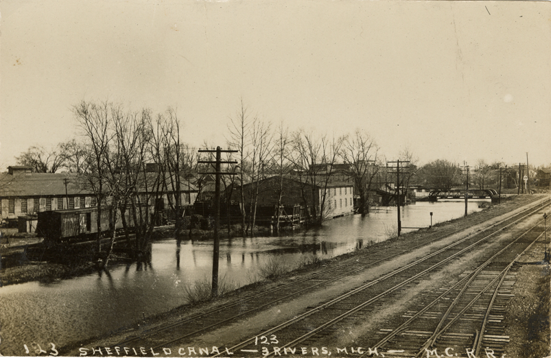 View of the Sheffield Canal in Three Rivers, Michigan. Buildings on left; railroad tracks on right. Printed on front: Sheffield Canal, 3 Rivers, Mich. M.C.R.R."