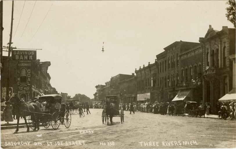 View of commercial buildings and horse-drawn carriages on St. Joseph St. in Three Rivers, Michigan. Printed on front: "Saturday on St. Joe St., no. 338, Three Rivers, Mich. Pratt."