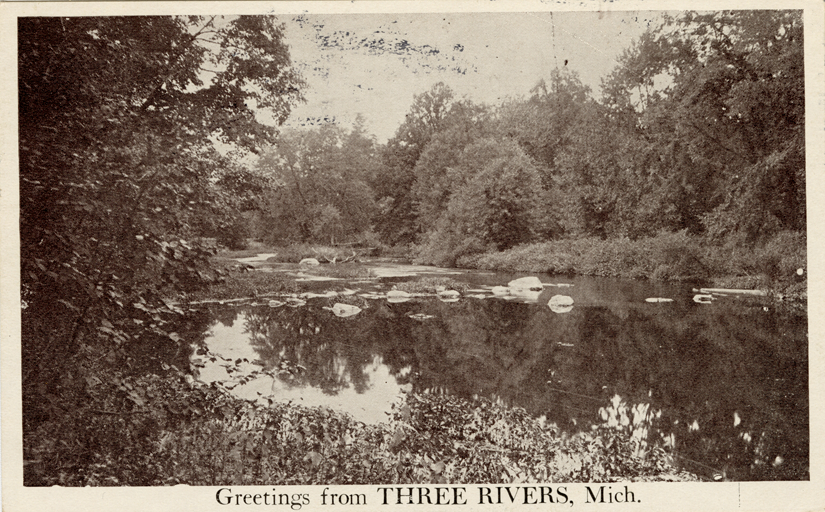 View of a river and riverbank in Three Rivers, Michigan. Printed on front: "Greetings from Three Rivers, Mich." Printed on back: "2464, 32 des. Photo Brown. General scenes, no. 142."