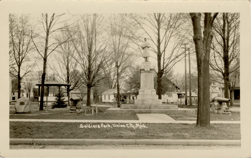 View of a soldiers' monument at Soldiers' Park in Union City, Michigan. Cannons in foreground; gazebo in background. Printed on front: "Soldiers Park, Union City, Mich."