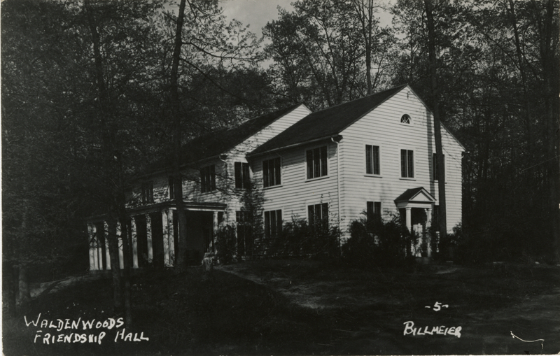 View of Friendship Hall at the Waldenwoods resort in Hartland, Michigan. Printed on front: "Waldenwoods, Friendship Hall. Billmeier, 5."