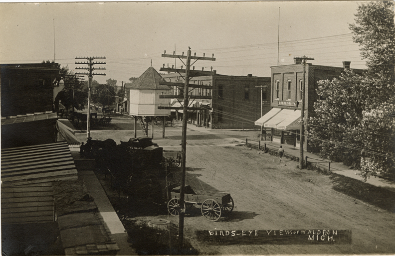 View of commercial buildings and bandstand on an unidentified street in Waldron, Michigan. Printed on front: "Bird's-eye view of Waldron, Mich."