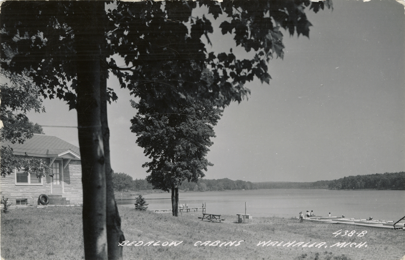 View of Bedalow Cabins resort on lake in Walhalla, Michigan. Cabin on left. Printed on front: "Bedalow Cabins, Walhalla, Mich." Handwritten on back: "Hi! We sure are on a pretty lake this year. The kids have a swell beach to play in. Catching plenty of eating fish. But no prize ones as yet. Louise." Card is postmarked July 7, 1953.