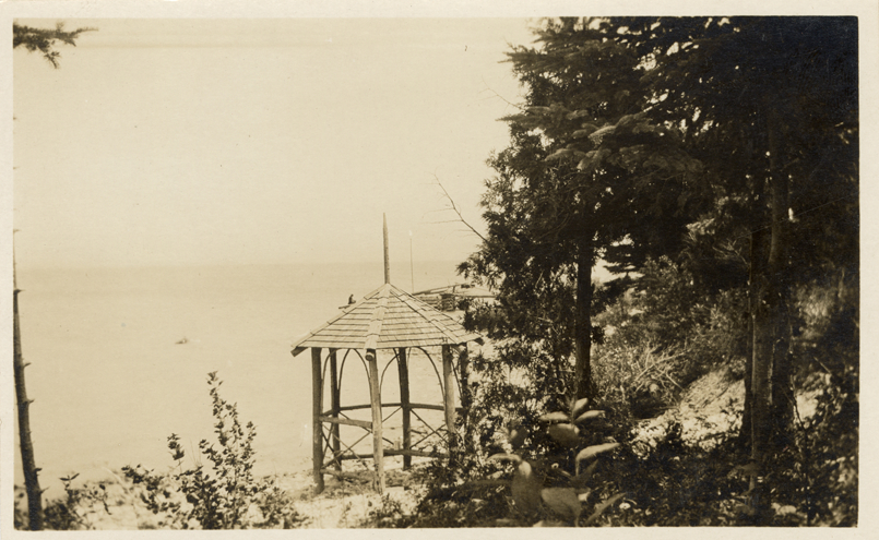View of a gazebo at Wawatam Beach in Mackinaw City, Michigan. Handwritten on back: "Wawatam Beach."