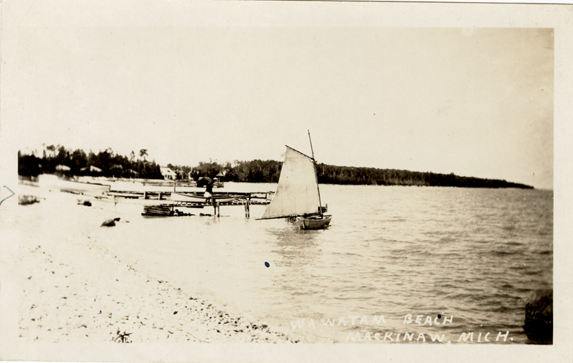 View of a sailboat at Wawatam Beach in Mackinaw City, Michigan. Printed on front: "Wawatam Beach, Mackinaw, Mich."