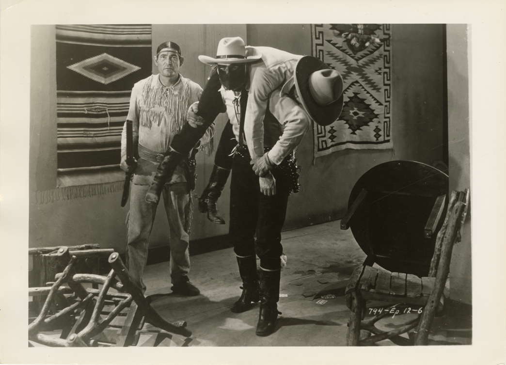 View of the Lone Ranger and Tonto rescuing a cowboy. Overturned tables and chairs in room. Printed on front: "794-Ep. 12-6." Label on back: "2. Tonto and the Lone Ranger affect a rescue."