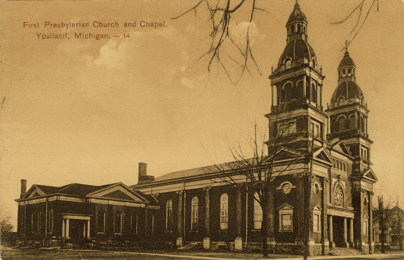 View of the First Presbyterian Church in Ypsilanti, Michigan. Printed on front: "First Presbyterian Church and chapel, Ypsilanti, Michigan." Printed on back: "Published by Chas. F. Gee, Ypsilanti, Mich. Printed in Germany." Handwritten on back: "Dec 7, 1911. Dear May, I got your card and was glad to hear from you. Our pastor and son visited me yesterday he is a very pleasant man and is liked very much. I am much better than I was when you were har [sic]. Mother." Card is postmarked December 8, 1911.