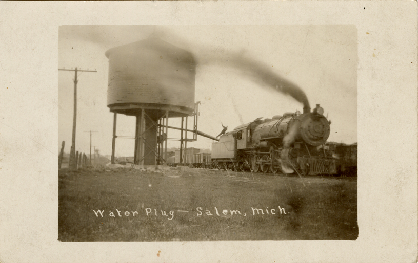 View of a locomotive next to a water plug or water station at Salem, Michigan. Printed on front: "Water plug, Salem, Mich." Handwritten on back: "Salem, Aug. 7-13. Dear Wife, Will not be home till next Wed. night. Love to kids, Ned." Card is postmarked August 8, 1913.