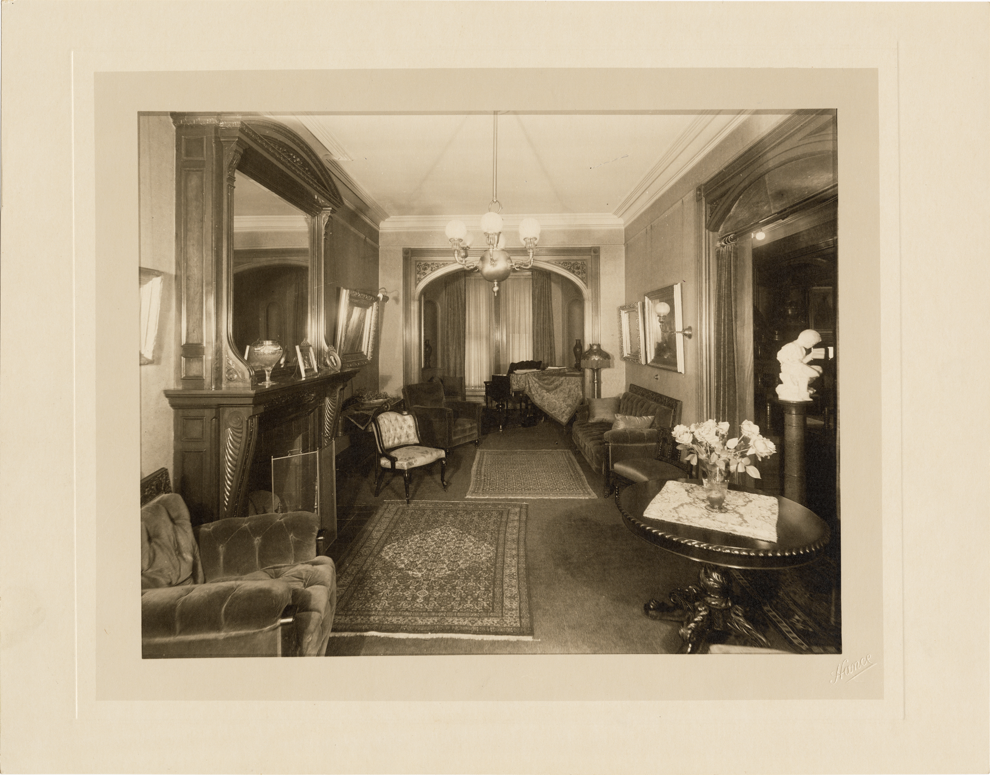 View of the living room in the house located at 3977 Second Ave., on the corner of Alexandrine. Room is furnished with chairs, sofa, artwork and Oriental rugs. Fireplace on left. Embossed on front: "Hance."