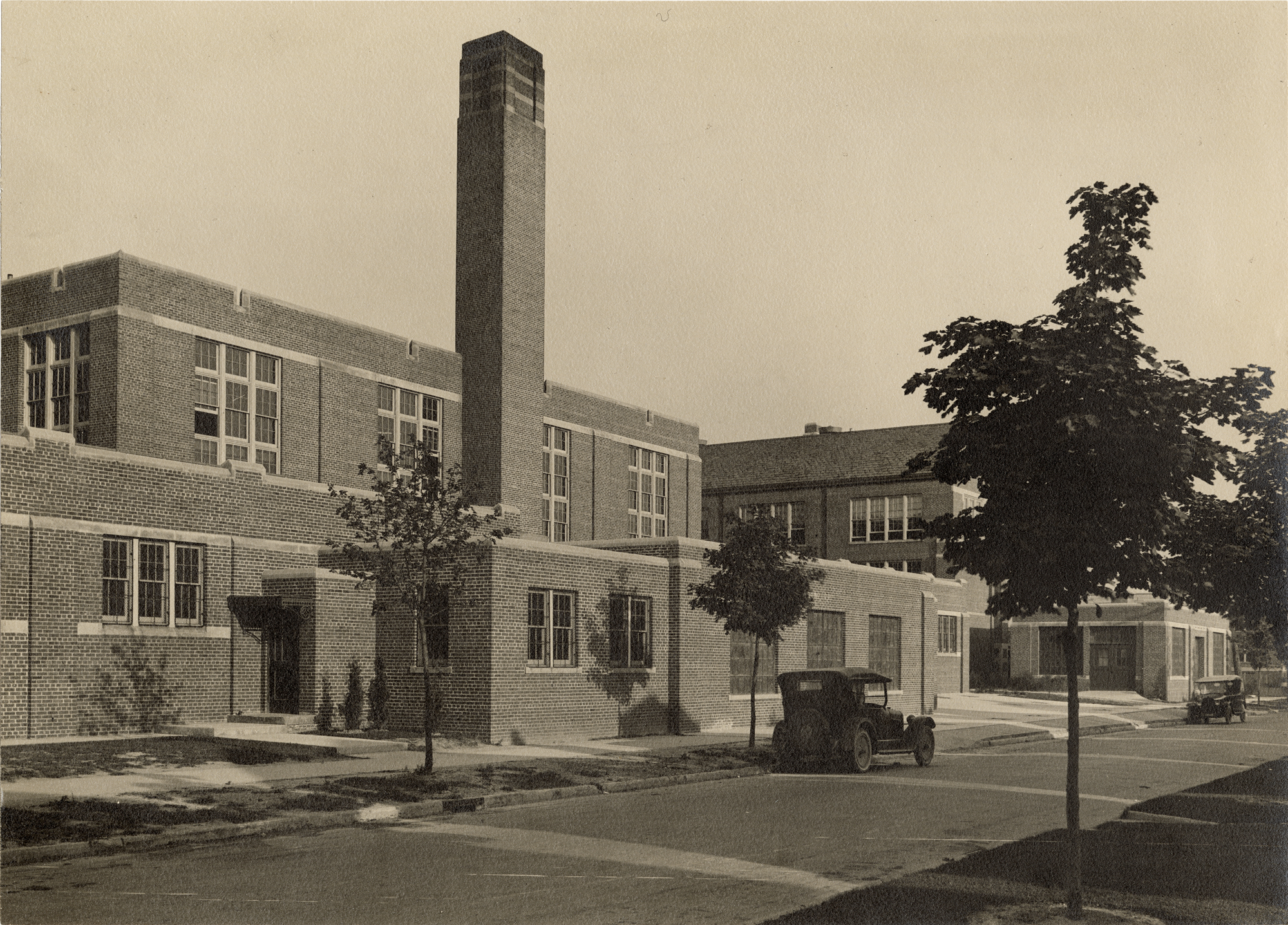 View of a car parked next to an unidentified brick school building in Detroit, Michigan.