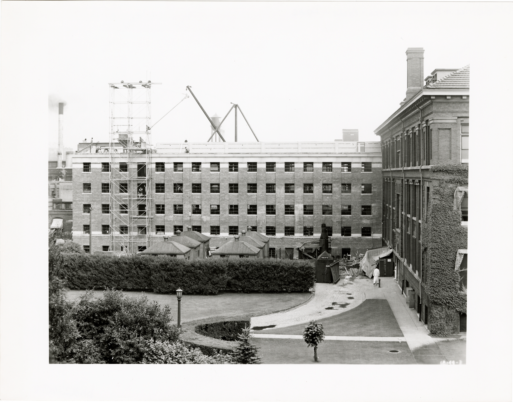 View of the Parke, Davis & Company Research Building during construction. Handwritten on back: "New Research Bldg., 7/15/40."