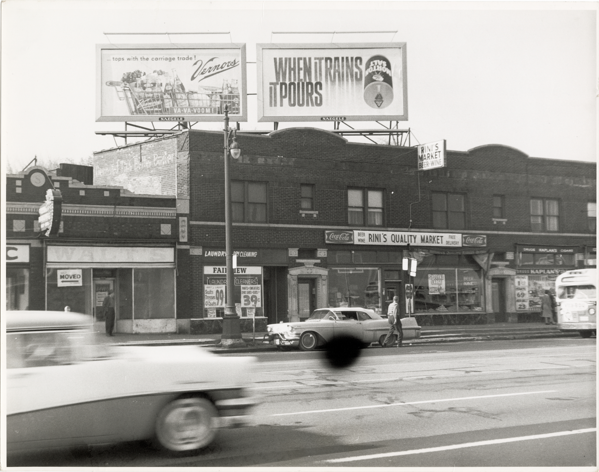 View of Rini's Quality Market, a dry cleaners and Kaplan's drugstore on Jefferson Ave. Billboards for Vernor's soft drink and Morton salt displayed on roof; cars in street. Handwritten on back: "Jefferson."