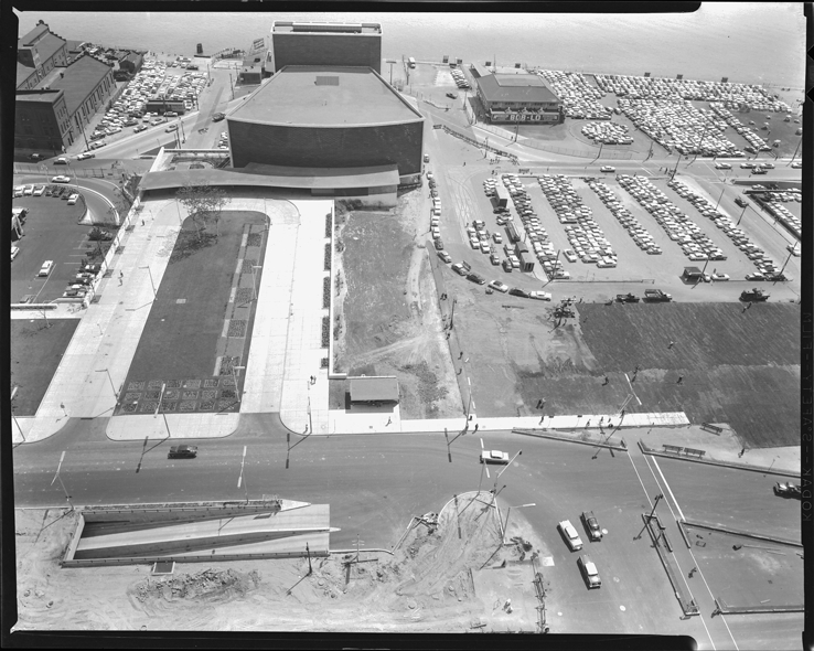 Bird's-eye view of Ford Auditorium. Cars in parking lot on right.