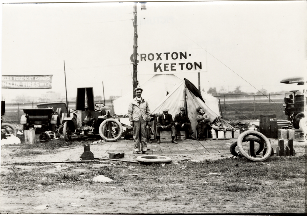 View of Croxton-Keeton crew resting in front of tent during 1910 Brighton Beach races in New York. Tires in foreground. Handwritten on back: "Croxton-Keeton, 1910. Brighton Beach, 5-13-10."