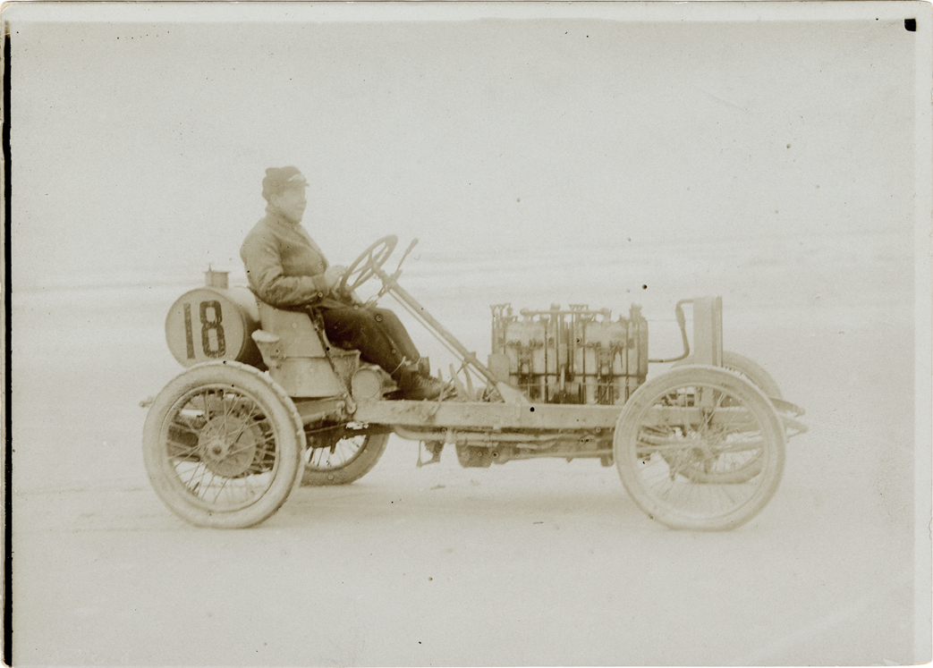 View of driver S.B. Stevens posing in Darracq car no. 18 during the 1906 Ormond-Daytona races in Florida. Stamped on back: "Photo by F. Ed. Spooner, 1536 B'way, telephone 6536-38th St., New York, N.Y." Handwritten on back: "S.B. Stevens [undecipherable] champion. S.B. Stevens, Darracq, Ormond-Daytona, 1906."