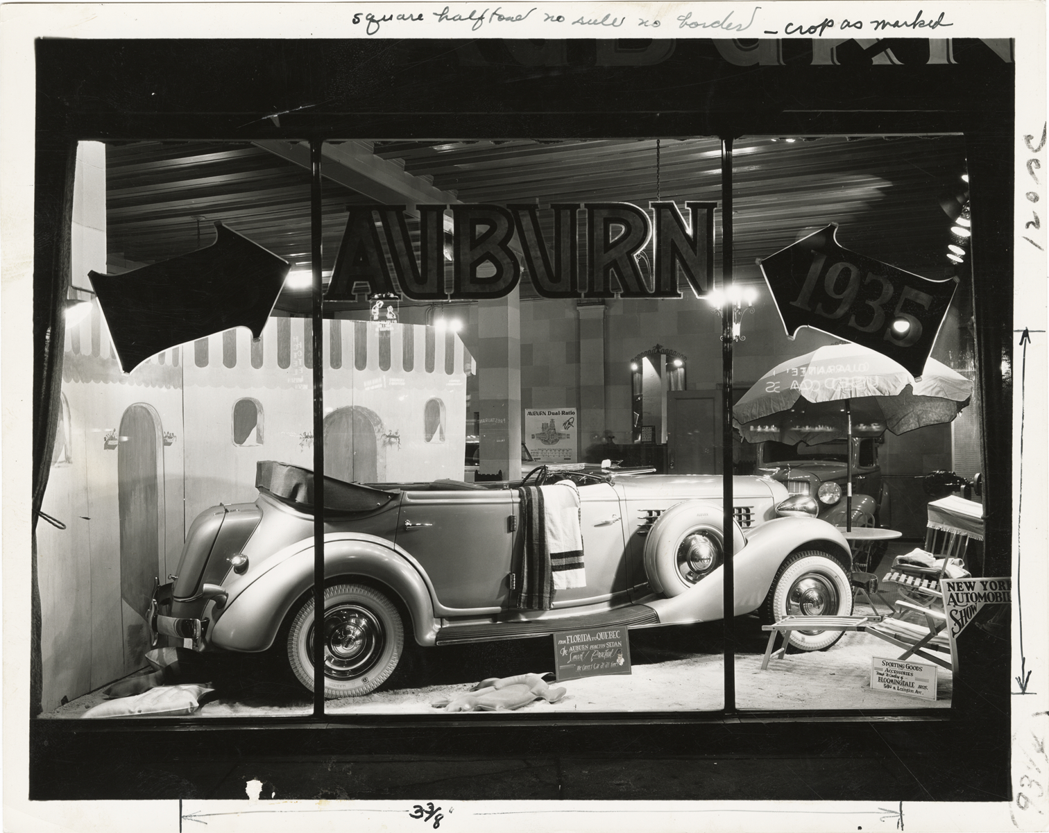 Nighttime view of a display window at the Auburn Automobile Company dealership. Car is visible through windows, with umbrella table, sand, chaise lounge and facsimile of a beach house; "Auburn, 1935" signs displayed in window. Stamped on back: "Studio of John Adams Davis, Printing Crafts Building, 461 Eighth Ave., New York. Medaillon 3-5030. For duplicate of this title, refer to negative number 17L1." Handwritten on back: "Dealers--Auburn. Window display."