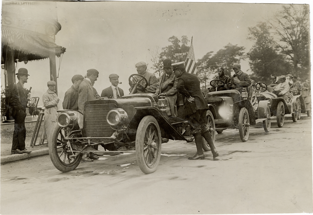 View of motorists in a 1907 Deere car, followed by other cars. Policeman leans over car. Stamped on back: "Spooner and Wells, 1931 Broadway, New York, duplicates any time, enlargements all sizes, tel. 3472-3473 Col., credit appreciated." Handwritten on back: "Deere, 1907."