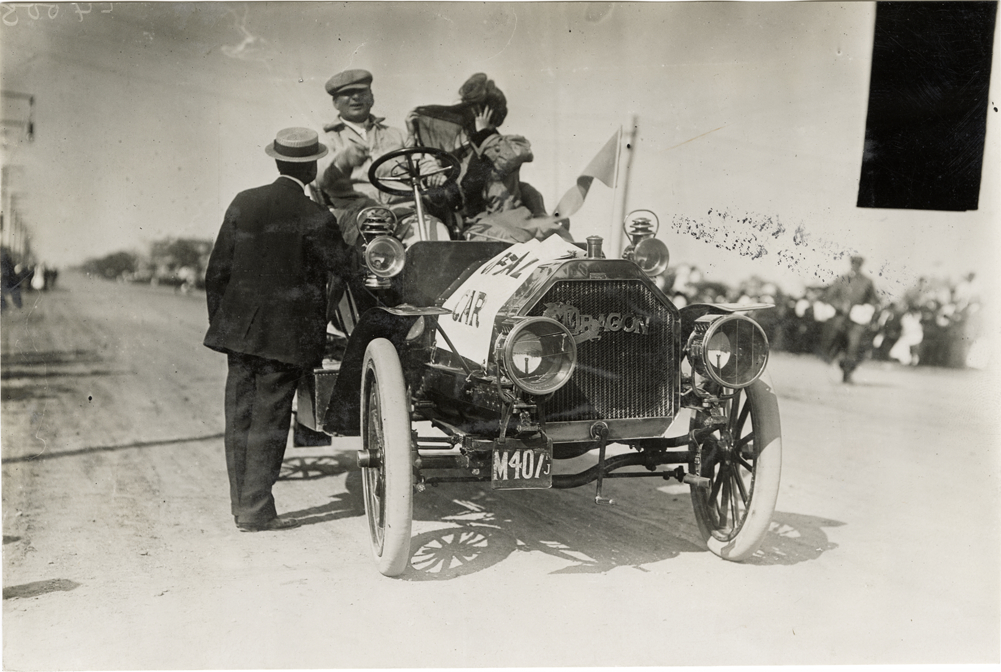 View of motorists in Dragon car. "Official car" sign is displayed on car. Handwritten on back: "Dragon, Glidden, 1907."