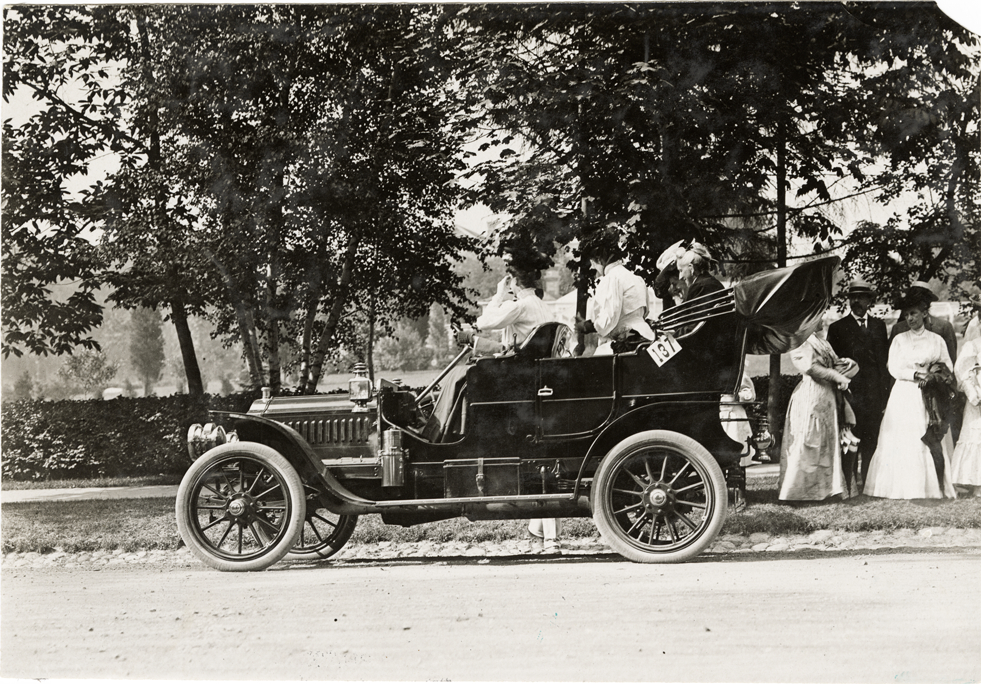 View of motorists in 1909 Elmore car. Stamped on back: "Spooner & Wells, Inc., photographers, telephones 3472-3473 Columbus, 1931 Broadway, New York." Handwritten on back: "Elmore, 1909."