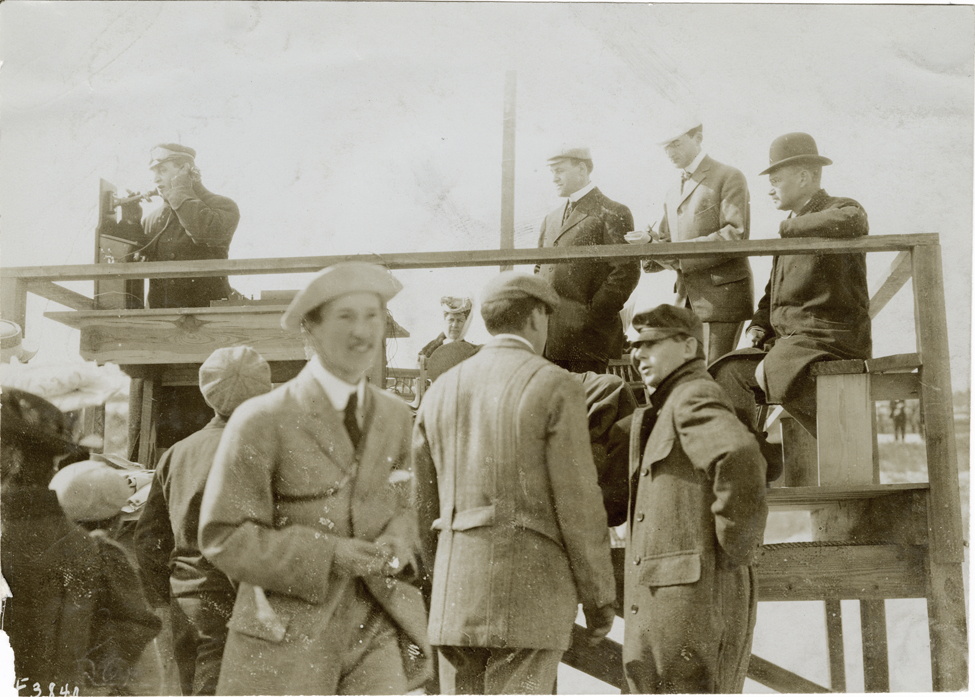 View of judges and timers on stand during the 1908 Ormond-Daytona races in Florida. Stamped on back: "Photo by N. Lazarnick, 29 West 42nd Street, New York." Handwritten on back: "Judges & timers stand. Races and racing--Ormond-Daytona, 1908."