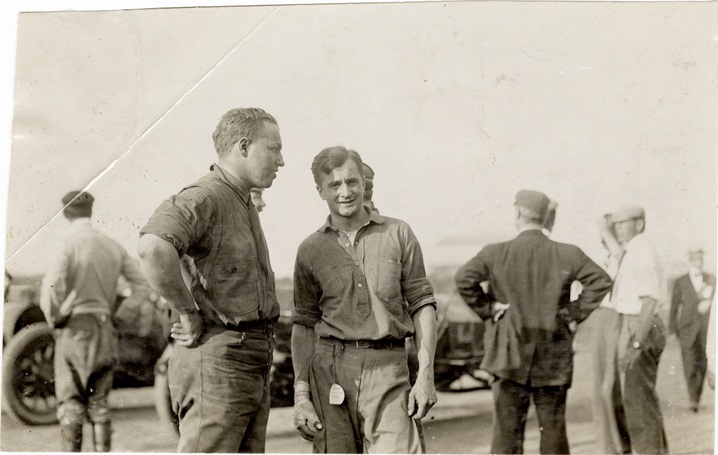 View of driver George Robertson and mechanic Al Poole. Stamped on back: "Photo by Spooner & Wells, Inc. 1931 Broadway, N.Y." Handwritten on back: "Robertson, Poole. Biography--Robertson, George."