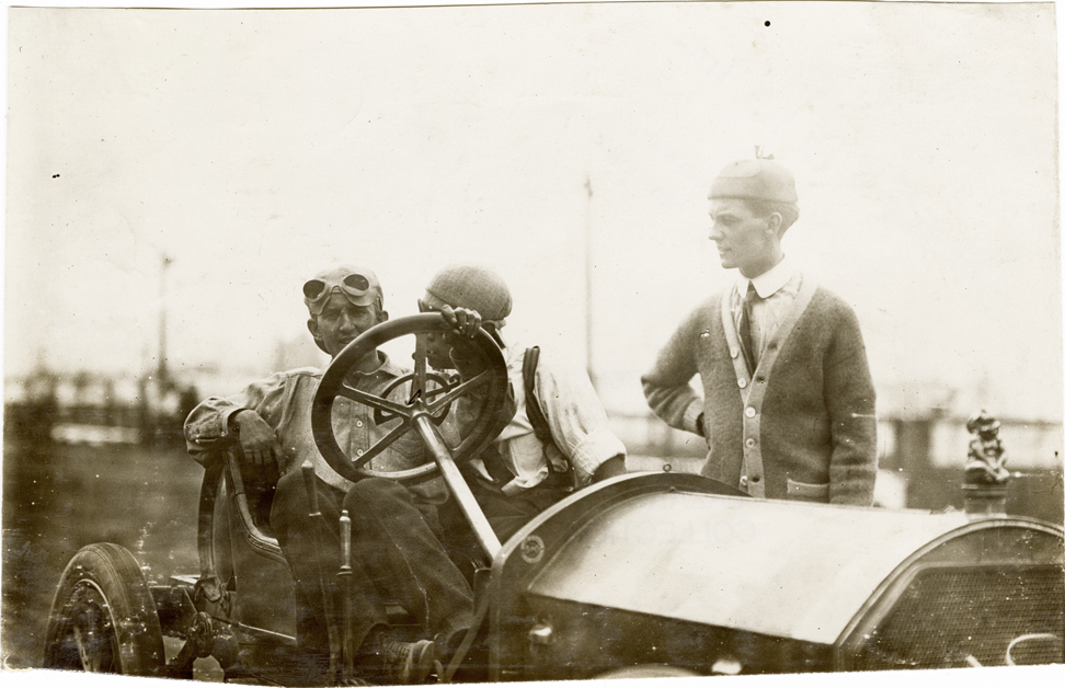 View of driver Jean Juhasz posing in S.P.O. racecar. Stamped on back: "Spooner & Wells, Inc., photographers, telephones 3472-3473 Columbus, 1931 Broadway, New York." Handwritten on back: "Juhasz at wheel S.P.O. Biography--Juhasz, Jean."