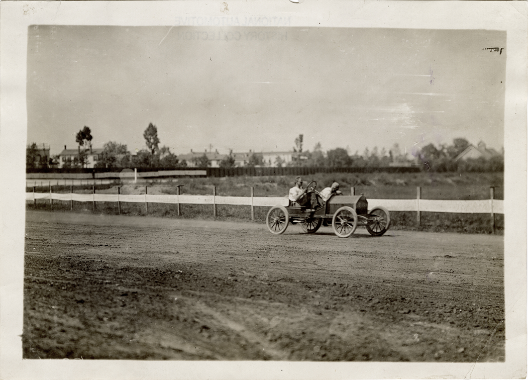 View of driver Fred Woltman and passenger racing Hupmobile car on track. Stamped on back: "Photo by Spooner & Wells, Inc. 1931 Broadway, N.Y." Handwritten on back: "Hupp driven by Woltman."