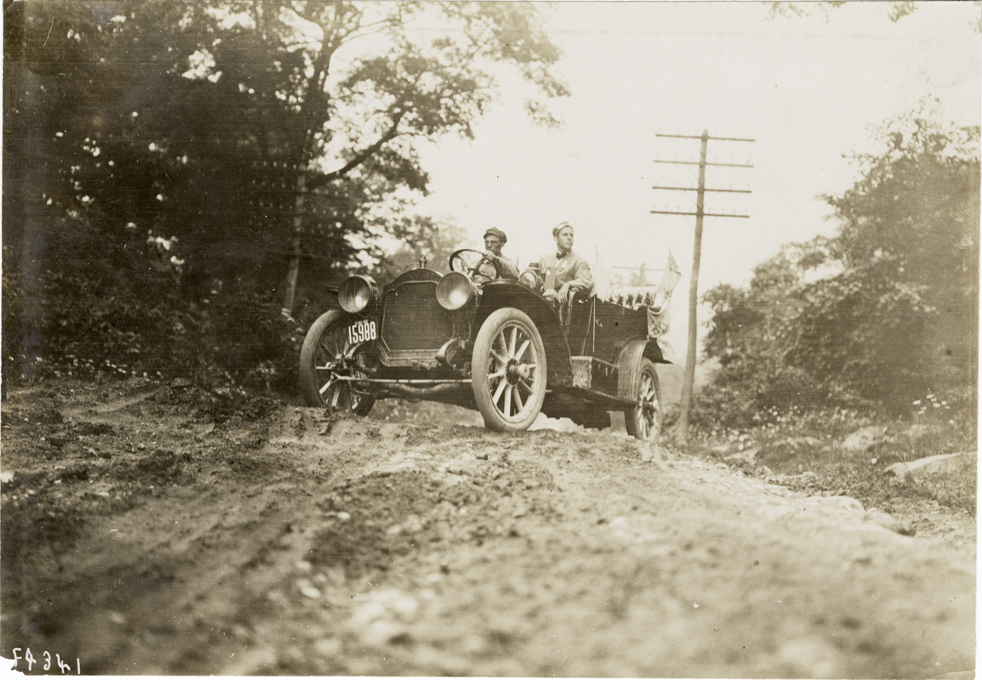 View of motorists in a Packard car on rural dirt road. Handwritten on back: "Packard."