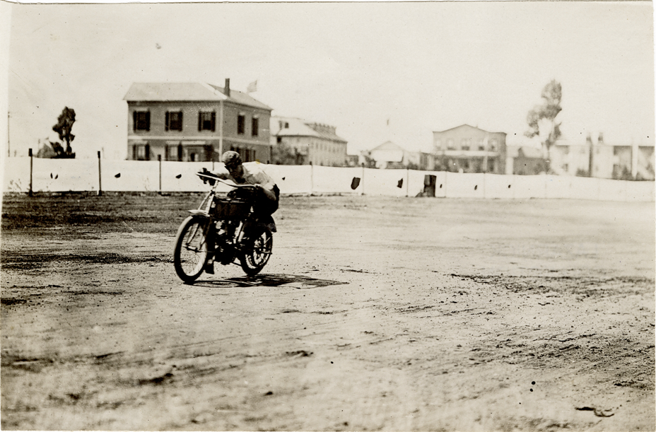 View of Robinson racing motorcycle on track. Stamped on back: "Photo by Spooner & Wells, Inc. 1931 Broadway, N.Y." Handwritten on back: "Robinson. Motorcycles."