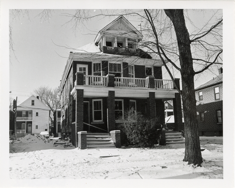View of two-story duplex located at 857-859 Drexel. Stamped on back: "Photography by D. Bruce Banta, Detroit." Handwritten on back: "#203, 857-59 Drexel."