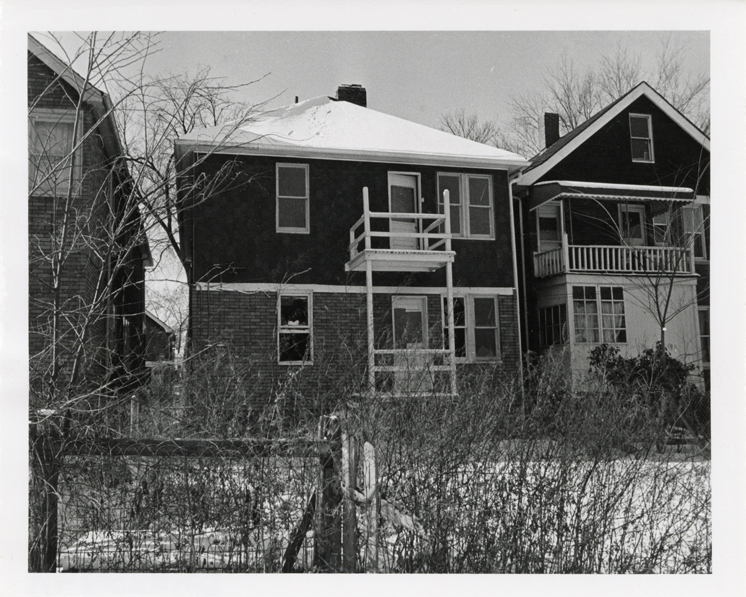 Rear view of a two-story house, possibly a duplex, located at 644-646 Drexel. Stamped on back: "Photography by D. Bruce Banta, Detroit." Handwritten on back: "#209, 644-46 Drexel."