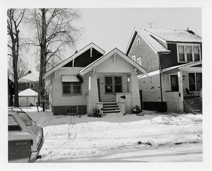 View of a house with covered entry porch located at 579 Drexel. Stamped on back: "Photography by D. Bruce Banta, Detroit." Handwritten on back: "#214, 579 Drexel."