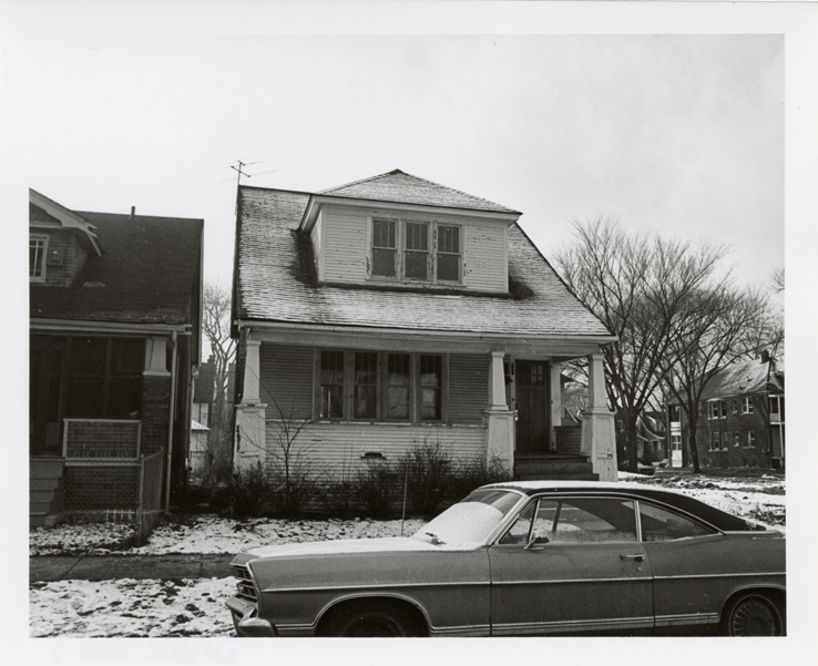 View of a two-story, wooden-frame house with covered entry porch located at 685 Eastlawn. Stamped on back: "Photography by D. Bruce Banta, Detroit." Handwritten on back: "#227, 685 Eastlawn."