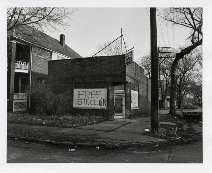 View of Lumetta's Super Market located at 702 Newport. "Free Sinclair" and "Power to the people" signs in windows. Stamped on back: "Photography by D. Bruce Banta, Detroit." Handwritten on back: "#231, 702 Newport."