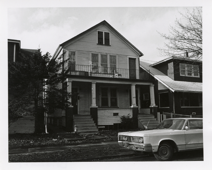 View of a two-story, wooden-frame house, possibly a duplex, located at 683-685 Newport. Automobile in foreground. Stamped on back: "Photography by D. Bruce Banta, Detroit." Handwritten on back: "#232, 683-85 Newport."