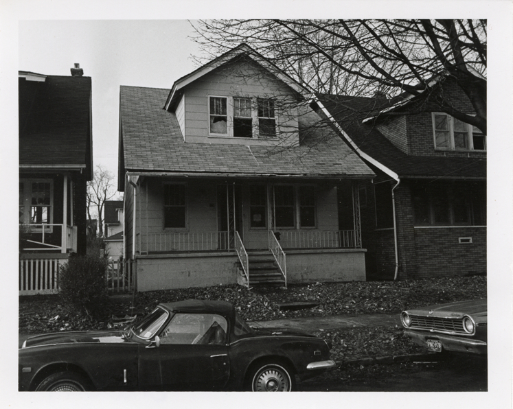 View of a house with covered entry porch located at 525 Newport. Automobiles in foreground. Stamped on back: "Photography by D. Bruce Banta, Detroit." Handwritten on back: "#233, 525 Newport."
