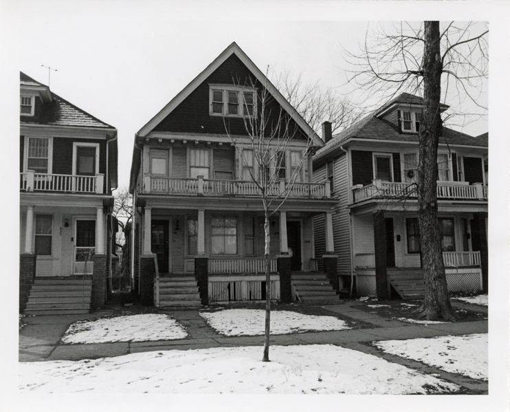 View of a two-story, wooden-frame house with covered entry porch, possibly a duplex, located at 839-841 Piper. Stamped on back: "Photography by D. Bruce Banta, Detroit." Handwritten on back: "#224, 839-41 Piper."