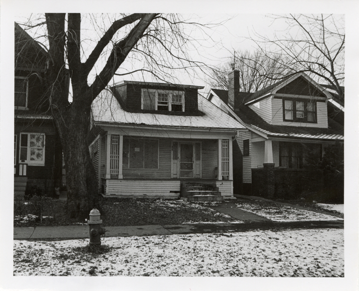 View of a wooden-frame house with covered entry porch located at 787 Piper. Stamped on back: "Photography by D. Bruce Banta, Detroit." Handwritten on back: "#225, 787 Piper."