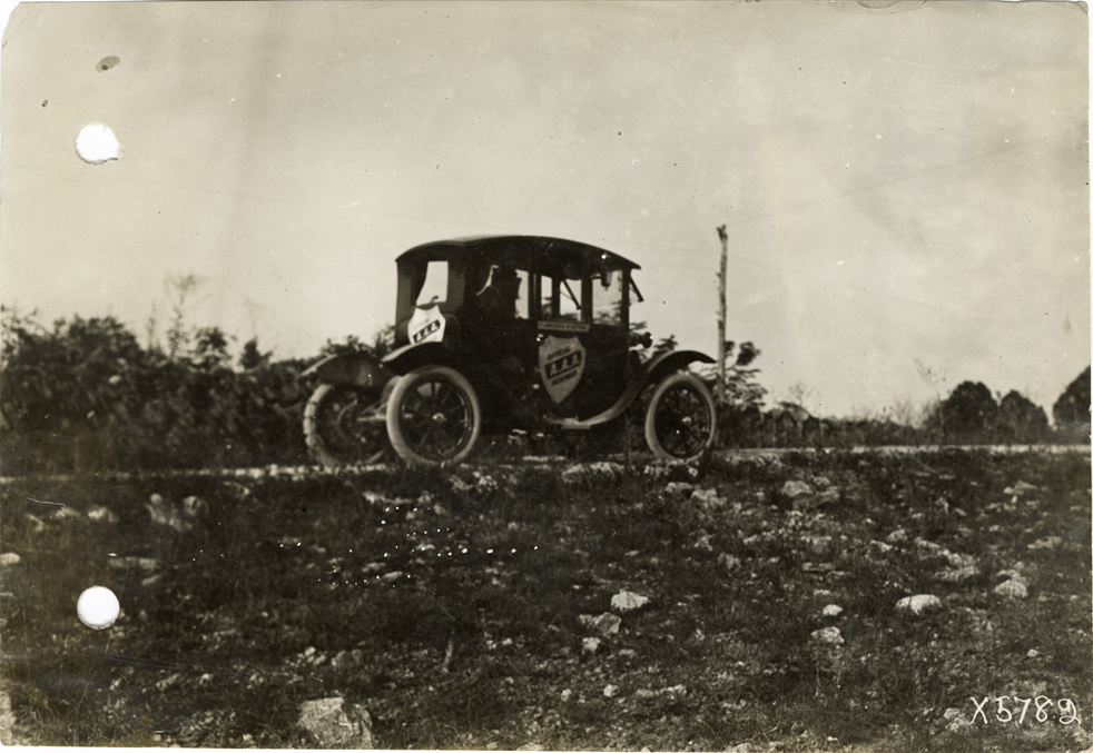 View of Flanders electric car traveling on the Bardstown Pike, Kentucky, during the pathfinding expedition for the 1912 Glidden Tour. The pathfinding tour covered a route from Detroit, Michigan to New Orleans, Louisiana, but the 1912 Glidden Tour was canceled. Stamped on back: "Spooner & Wells, Inc., photographers, 1231 Woodward Ave., Detroit, Mich., telephone North 1745." Handwritten on back: "Pathfinder on Bardstown Pike, 1912."